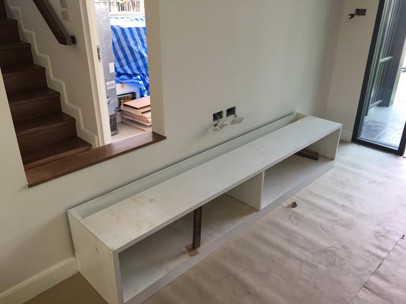 และก็ทำชั้นเก็บของข้างบนเพียงแค่ 2 ล็อค เนื่องจากปรารถนาความโปร่งสบาย ส่วนฝาผนังโทรทัศน์ รวมถึงชั้นเก็บของข้างล่าง ใช้ลามิเนตลายไม้ลักษณะเดียวกันกับ Walk in closet โดยชั้นเก็บของเป็นแบบบานเลื่อนหน้าเดียว ซึ่งก็ได้ย้ายปลั๊กไฟทั้งหมดทั้งปวงมาไว้ภายใน เพราะว่าลูกยังเล็ก รวมทั้งอยากเก็บสายไฟไว้ภายใน