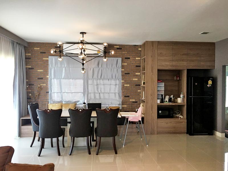6 ทำฝาผนังข้างหลังโทรทัศน์รวมทั้งโซนโต๊ะสำหรับรับประทานอาหาร (ส่วนนี้ตั้งอกตั้งใจหาซื้อฝาผนังก้อนอิฐเลียนแบบมาติดเอง)