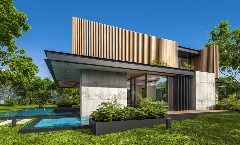 ปลูกต้นไม้ให้ได้โดยประมาณ 20% ของพื้นที่ เพื่อช่วยกรองมลภาวะ ช่วยให้อากาศสดชื่น แต่ว่าต้องระมัดระวังอย่าปลูกบังแนวทางลมเข้าบ้าน เป็นต้นว่า ไม้ยืนต้นให้ร่มเงา ไม้เลื้อย แล้วก็ไม้ขัดอากาศ