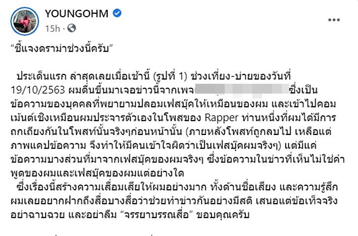 โดย YOUNGOHM ได้เปิดเผยว่ามีคนมานะปลอม Facebook เขาและก็ไปด่าทอผู้อื่น ซึ่งใจความทั้งปวงมิได้มาจากเขา แล้วก็เหตุที่เกิดขึ้นได้ทำความเสียหายอย่างยิ่งให้กับเขาอีกทั้งชื่อเสียงและความรู้สึก