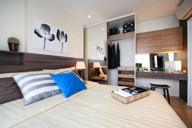 สำหรับห้องนอนขนาดเล็ก บอกเลยว่าอย่าละเลยสีฟ้า (Sky Blue) เด็ดขาด เพราะว่านอกเหนือจากสีนี้จะช่วยอำพรางตา ขยายห้องให้กว้างขึ้นแล้ว ยังช่วยทำให้บรรยากาศบรรเทา สบายตาเสมือนกำลังฝันอีกด้วย